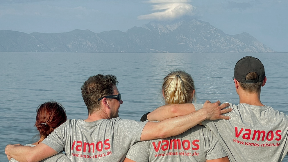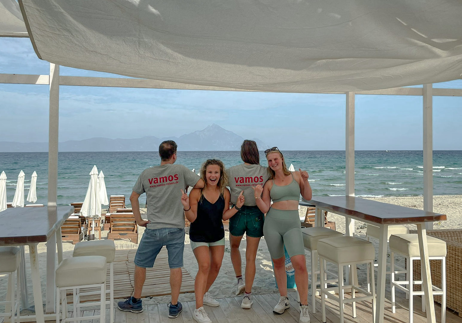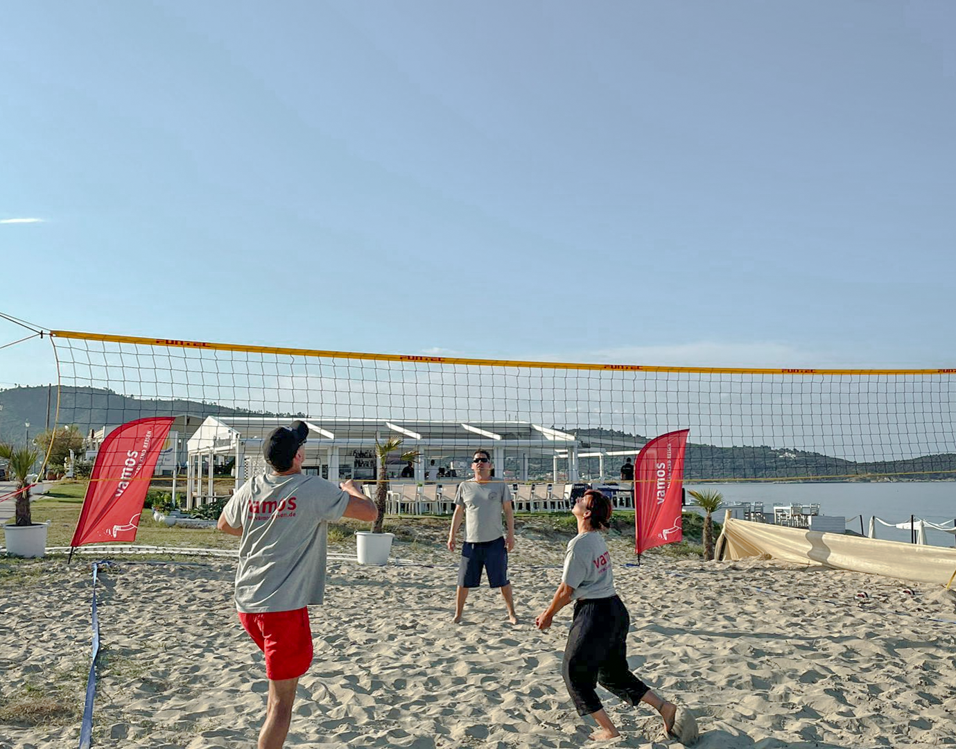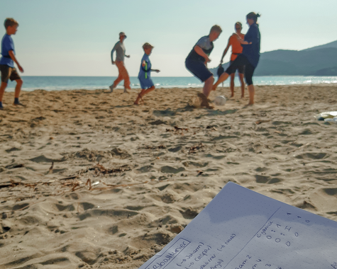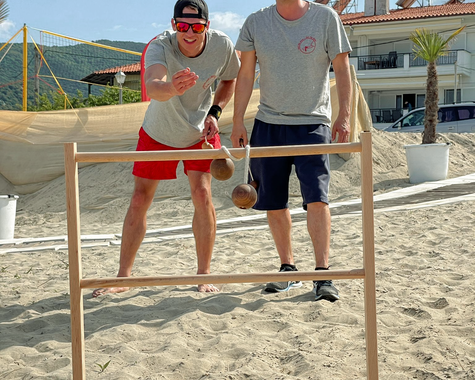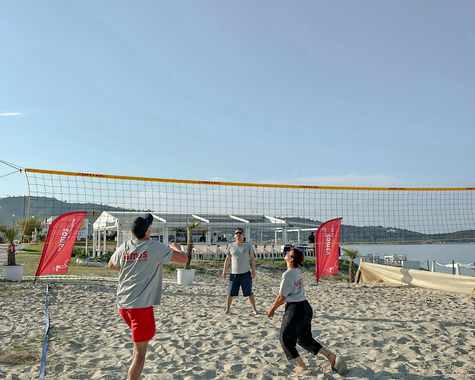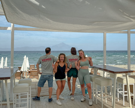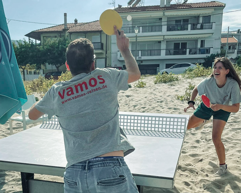 Im VAMOS Jugendprogramm (ab 12 Jahren) steht in den Pfingst-, Sommer- und Herbstferien vor allem eines im Mittelpunkt: Strand, Bewegung und Gemeinschaft. Ob bei Beachvolleyball, Wasserball oder einer Klippenwanderung – hier ist Action garantiert. Ein Treffpunkt für Jugendliche und Eltern ist die hauseigene Strandbar, besonders lebendig beim wöchentlichen vamos Familienabend, etwa bei einem Table-Quiz am Meer. Der Beach-Treff dreimal pro Woche bringt Schwung an den Strand – für Jugendliche und Erwachsene gleichermaßen. Ein weiteres Highlight: Gastgeber Grigorios lädt alle vamos Familien einmal pro Woche zu einem gemeinsamen Abendessen ein (gegen Entgelt) – eine schöne Gelegenheit zum Kennenlernen und Genießen.