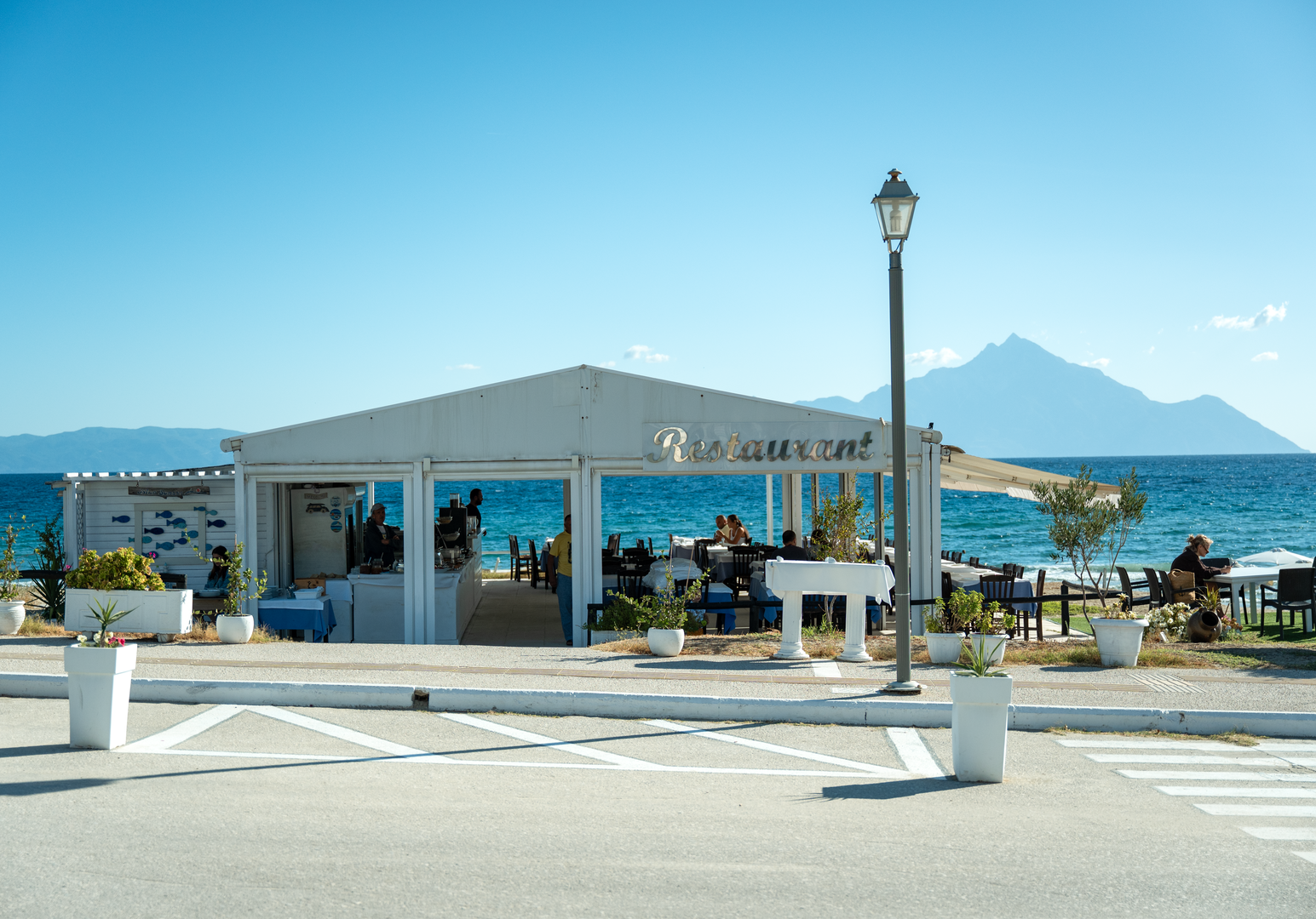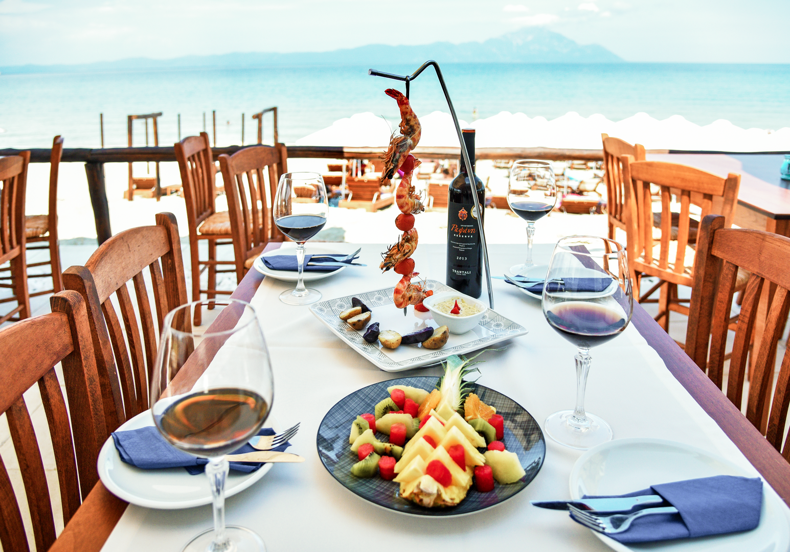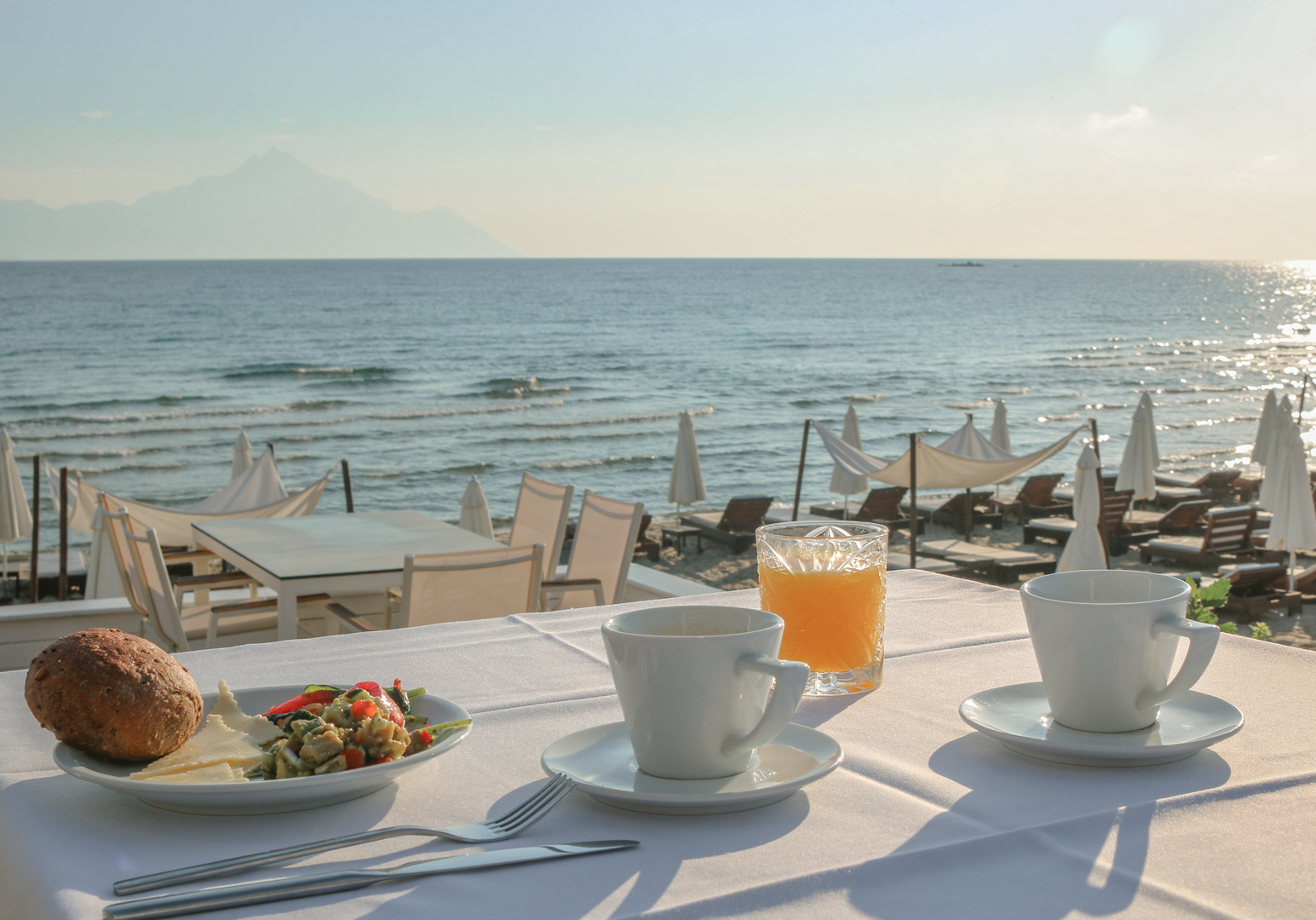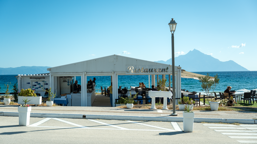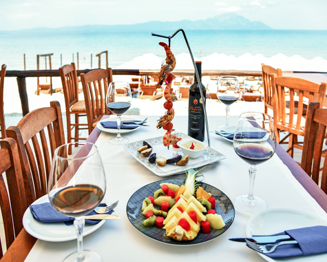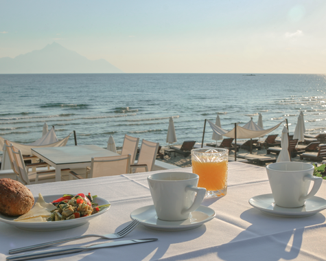 Morgens startet ihr entspannt am Frühstücksbuffet direkt am Meer in den Tag. Mittags und abends genießt ihr frische, griechische Küche im hoteleigenen Restaurant – zubereitet mit Zutaten aus der Region.