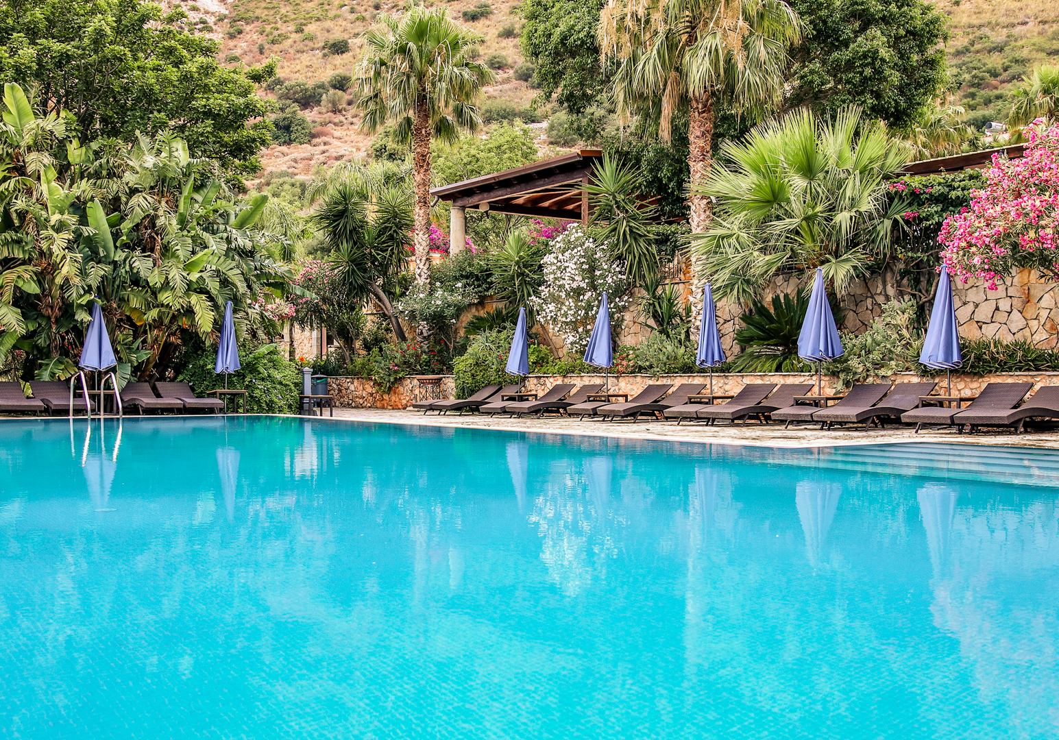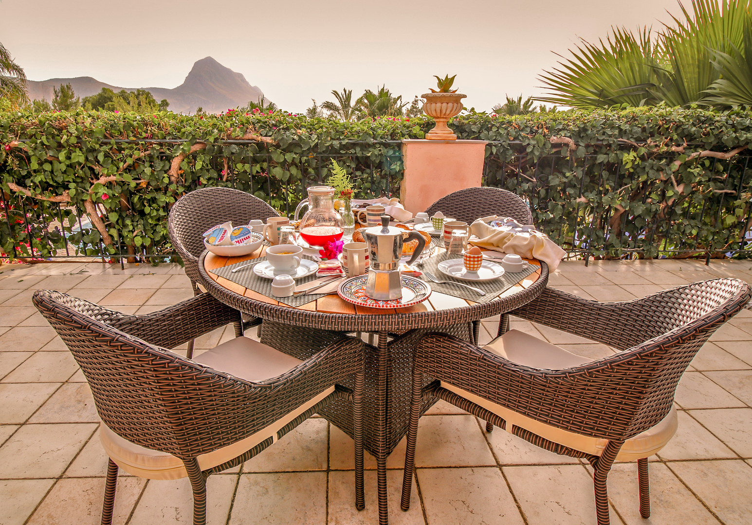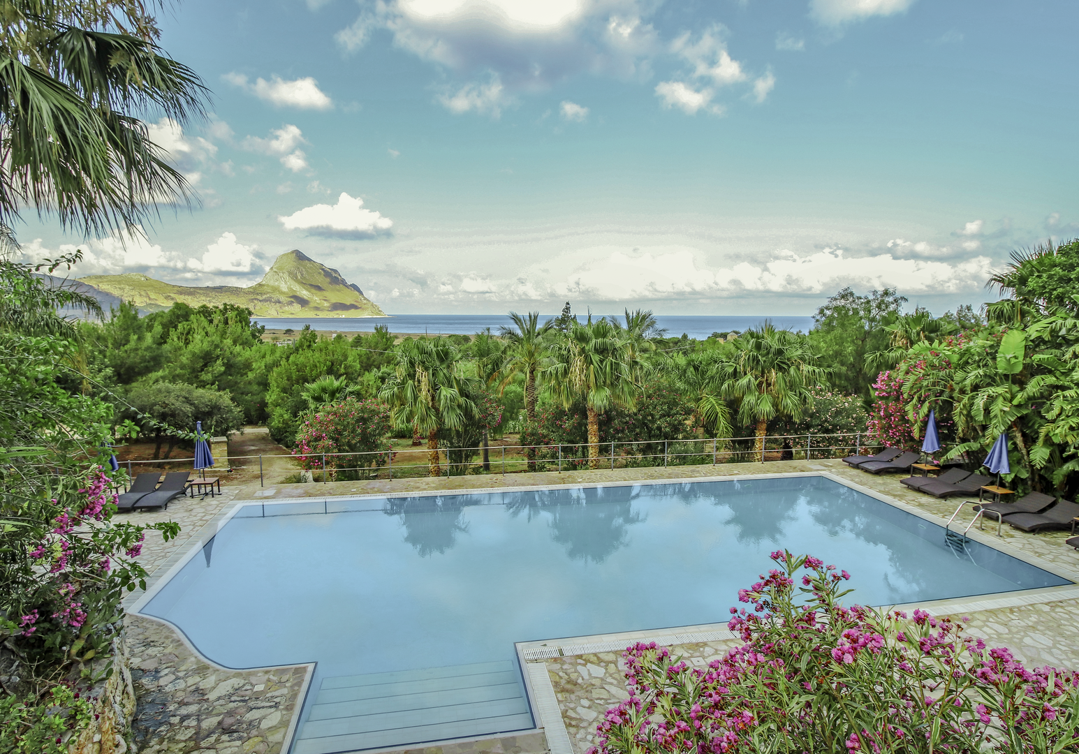 Auf eurer Terrasse oder dem Balkon könnt ihr morgens frühstücken – optional bucht ihr vor Ort das kleine Frühstücksbuffet und startet auf der Gemeinschaftsterrasse über dem schönen Pool (8 × 16 m) in den Tag.