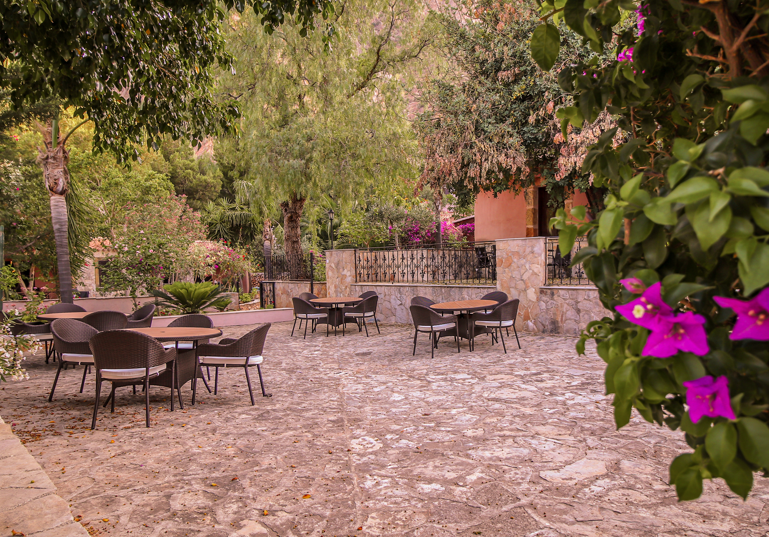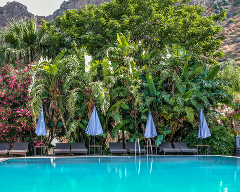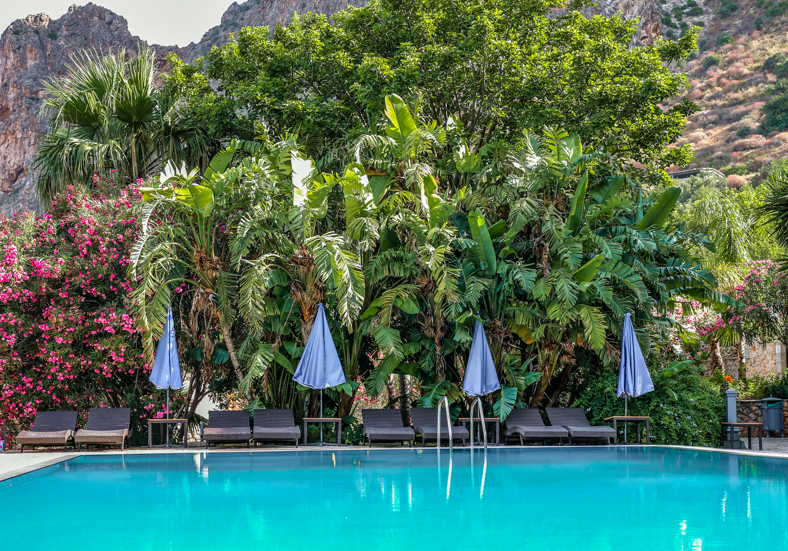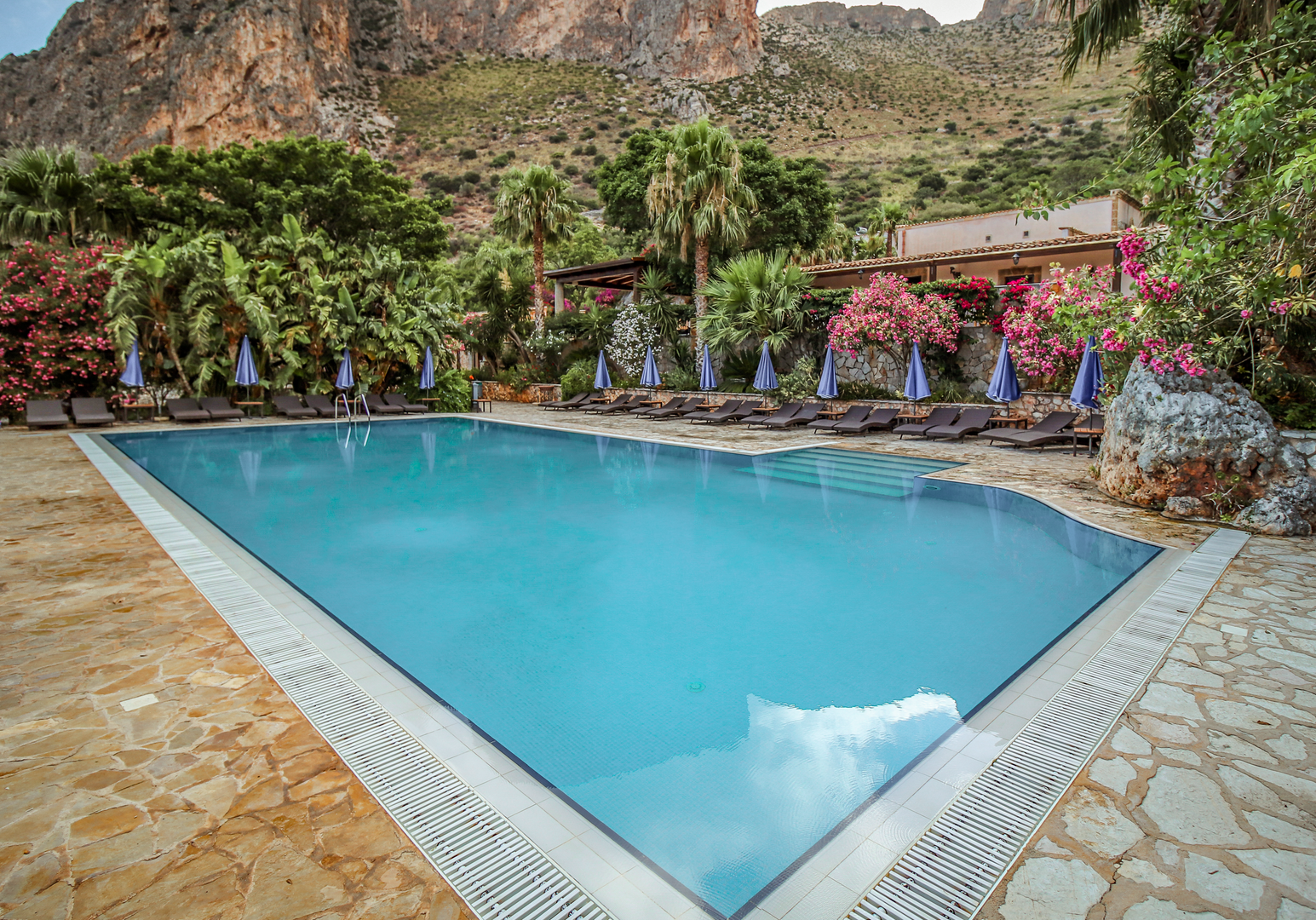 Auf eurer Terrasse oder dem Balkon könnt ihr morgens frühstücken – optional bucht ihr vor Ort das kleine Frühstücksbuffet und startet auf der Gemeinschaftsterrasse über dem schönen Pool (8 × 16 m) in den Tag.
